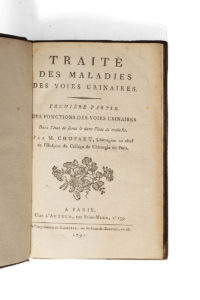 MEDECINE]. CHOPART (François). Traité des maladies des voies urinaires. A Paris, Chez l'auteur, 1791-1792. 2 volumes in-8°, basane marbrée, dos lisse orné, tranches marbrées (reliure de l'époque). En trois parties : * Des fonctions des voies...