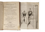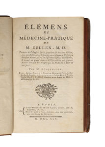 frontispice. - CULLEN (William). Elémens de médecine-pratique. Traduits de l'anglois sur la quatrième & dernière édition, avec des notes, dans lesquelles on a refondu la nosologie du même auteur, décrit les différentes espèces de maladies […] par M. Bosquillon. A Paris, chez Théophile Barrois, Méquignon, 1795. In-8° (premier tome seul), basane marbrée, dos à nerfs orné, tranches rouges (reliure de l'éditeur). Usures d'usage ; dos passé frotté, épidermures, coins émoussé, petites galeries et piqûres de ver. - [PORTAL (Antoine)]. Précis de chirurgie pratique, contenant l'histoire des maladies chirurgicales & la manière la plus en usage de les traiter [...]. 1 (sur 2) volume in-8°, veau marbré, dos à nerfs orné, tranches rouges (reliure de l'époque). Les deux premières parties seules du premier tome, manque le tome 2. Contient les 16 belles planches repliées représentant des instruments de chirurgie. - [PETITY (Jean-Raymon de)]. Sagesse de Louis XVI, manifestée de jour en jour, enseignée à ses peuples [...]. Ouvrage moral et politiques sur les vertus et les vices de l'homme. A Paris, Chez Gueffier, De Hansy, 1775. 1 (sur 2) volume in-8°, veau marbré, dos lisse orné (reliure de l'époque). Manque à la coiffe sup., petites usures au coins ; Seconde partie seule. Des bibliothèques du prince albanais Alladro Kastriotit & d'Antoine Hélard, avec leurs ex-libris.