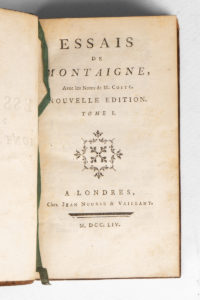 MONTAIGNE (Michel de). Essais. Avec des notes ; & une table générale des matières, plus utile que celles qui avoient paru jusqu'ici, par Pierre Coste. Nouvelle édition [...]. A Londres, Chez Jean Nourse. 1754. 10 volumes in-12, veau marbré, dos...