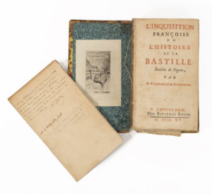 rare, ornée de 23 planches. Récit circonstancié des aventures de Constantin de Renneville, ancien mousquetaire converti au protestantisme, enfermé à la Bastille pendant plus de onze ans comme espion pour le compte de la Hollande ; le texte eut un grand retentissement et l'auteur écrira une suite qu'il publiera en 1724, dans une seconde édition en cinq tomes. De la bibliothèque Paul Lacombe avec ex-libris.