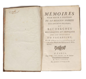 SAINTE-CROIX (Guillaume de). Mémoires pour servir à l'Histoire de la religion secrète des anciens peuples ; ou Recherches historiques et critiques sur les mystères du Paganisme. A Paris, Chez Nyon l'aîné, 1784 . In-8, veau marbré, dos lisse...