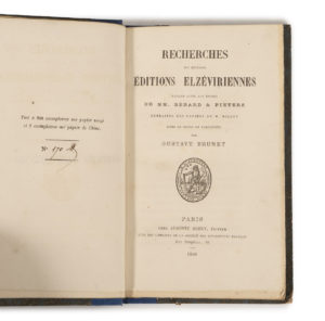 BRUNET (Gustave). Recherches sur diverses éditions elzéviriennes, faisant suite aux études de MM. Bérard & Pieters, extraites des papiers de M. Millot […]. Paris, Chez Auguste Aubry, 1866. demi-percaline bleue (reliure de l'époque). Un des 250...