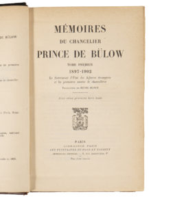 BULLOW (Prince de). Mémoires du Chancelier prince de Bülow. 1849-1919. Traduction de Henri Bloch. Paris, Plon, 1930-1931. 4 volumes in-8°, demi-chagrin brun, dos à nerfs, couvertures conservées (reliure de l'époque). Dos légt passé, nerfs et...