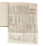 romains. A Paris, chez Firmin-Didot père et fils, 1822. In-8°, veau havane, encadrement de frises dorés et à froid sur les plats, rosace estampée à froid au centre, dos à nerfs orné (Duplanil). Dos passé avec manque, mors épidermés, manque au dos, rousseurs et petites mouillures. 20 planches dont repliées, et 32 planches in-fine. Très rare édition originale de ce traité dans lequel l'égyptologue Jean-François Champollion révèle pour la première fois les éléments fondamentaux du déchiffrement des hiéroglyphes.