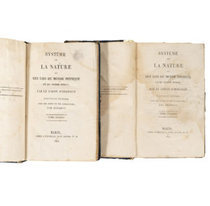HOLBACH (Paul Thiry baron d'). Système de la Nature, ou des lois du monde physique et du monde morale. Nouvelle édition avec des notes et des corrections par DIDEROT. Paris, Chez l'éditeur, 1820. 2 volumes in-8°, bradel cartonnage bleu nuit...