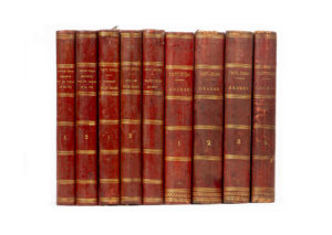 HUGO (Victor). [Oeuvres complètes]. Paris, Librairie internationale, A. Lacroix, Verboeckhoven, 1860-1877. 9 volumes in-8°, demi-basane rouge, dos lisse orné (reliure de l'époque). Dos passé. Rousseurs aux 4 premiers tomes. Contient : Drames,...