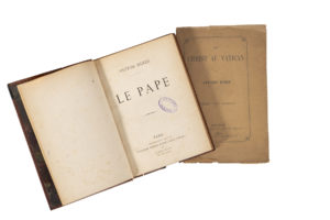 Pensées religieuses de Hugo dénonçant l'infaillibilité pontificale qui venait d'être proclamé. De la bibliothèque d'Alfred Cochin avec timbre humide au titre. JOINT : HUGO (Victor). Le Christ au Vatican. Genève, N. Guiletty, 1870. In-8, broché. Pamphlet anticlérical attribué à Hugo mais dont l'auteur serait Paul-Frédéric Cabantous.