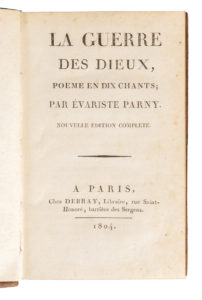PARNY (Evariste). Oeuvres diverses. Nouvelle édition corrigée et considérablement augmentée. A Paris, Chez Debray, an XI (1802). 3 volumes in-12, basane marbrée, dos lisse orné (reliure de l'époque). Dos passé, légères rousseurs. Contient :...