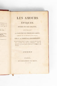 PARSEVAL GRANDMAISON (F.A.). Les Amours épiques. Poëme en six chants, contenant la traduction des épisodes sur l'Amour, composés par les meilleurs poète épiques. Paris, Dentu, 1806. In-8°, demi-maroquin rouge, dos lisse orné de filet doré...