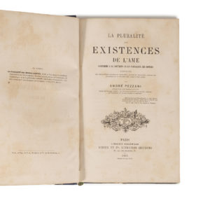 PEZZANI (André). La Pluralité des existences de l'âme conforme à la doctrine de la pluralité des mondes [...]. Paris, Didier et Cie, 1865. In-8, demi-percaline bleu (reliure de l'époque). Rousseurs.