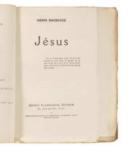 BARBUSSE (Henri). Jésus. Paris, Flammarion, 1927. In-12, broché non rogné. EDITION ORIGINALE. Tirage à 200 exemplaires, celui-ci (n°12), un des 60 de tête sur vergé d'Arches. JOINT : * Les Judas de Jésus. Paris, Flammarion, (1927). In-12,...
