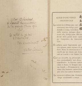 EDITION ORIGINALE, dédiée à Paul Claudel et imprimée sur les presses de la mission lazariste du Pei-T'ang, à Pékin ; elle est ornée de sept calligraphies chinoises à pleine page et de trois sceaux "apposés à la main et faits de cinabre impérial". Importante oeuvre poétique d'un "genre littéraire nouveau" selon les voeux de l'auteur qu'il composa au retour de sa première expédition en Chine ; elle renferme près de 150 poèmes en prose, avec des épigraphes en calligraphie classique. Dans une lettre adressée à Gilbert de Voisins, le poète explique sa démarche : "Cette édition, avec ses caractères chinois gravés sur bois constituera je crois une nouveauté bibliophilique, car ce n 'est pas une plaquette européenne décorée à la chinoise, mais un essai de tirage et de composition dans lequel la bibliophilie chinoise a une part équivalente aux lois du livre européen ." Tirage limité à 286 exemplaires, celui-ci (n°71) un des 81 exemplaires de tête sur papier impérial de Corée "dont aucun n'est commis à la vente". Précieux exemplaire offert par l'auteur "à Victor Goloubew, si fervent connaisseur de la grande Chine qui fut, ce reflet de là-bas et d'autrefois (...)" avec envoi autographe signé. Eminent orientaliste, spécialiste de l'extrême-orient, Goloubew (1878-1945) était un ami proche de Segalen.