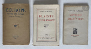 - DRIEU LA ROCHELLE. L'Europe contre les patries. Paris : Gallimard, [1931]. — In-12, broché. Édition originale.1/2270 sur papier d'Alfa. Couverture brunie, déchirures au dos.