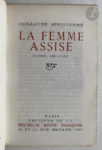 – APOLLINAIRE (Guillaume). La Femme assise. Paris : Nouvelle Revue Française, 1920. — In-16, cartonnage papier marbré à la Bradel, dos lisse, non rogné, couverture et dos conservés (reliure de l'époque). Édition originale. 1/1040 exemplaires sur vélin de Voiron. Usures au dos. Couverture brunie.