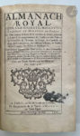 ALMANACH ROYAL, pour l'an bissextil MDCCXXVIII. — Calculé au Meridien de Paris. — Paris : imprimerie de la Veuve d'Houry, 1728. — In-8, veau brun, triple filet doré en encadrement, fleur de lys dorée aux angles et armes dorées au centre sur...