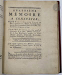 5 - Quatrième mémoire à consulter, pour Pierre-Auguste Caron de Beaumarchais… Contre M. Goezman, Juge accusé de subornation & de faux ; Madame Goezman, & le Sieur Bertrand, accusés ; les Sieurs Marin, Gazetier ; Darnaud-Baculard, Conseiller d'Ambassade ; & Consorts. Et réponse ingénue à leurs Mémoires, Gazettes, Lettres courantes, Cartels, Injures, & mille & une Diffamations. [Paris : impr. de J. G. Clousier, 10 février 1774]. Cordier, 338. Exemplaire bien complet du dernier feuillet proposant une note de Beaumarchais sur l'interdiction de représenter « Le Barbier d Séville ».