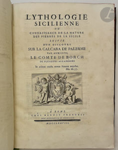 BORCH (Michel-Jean, Comte de). — Lythologie sicilienne ou connaissance de la nature des pierres de la Sicile suivie d'un discours sur la Calcara de Palerme. — Rome : Benoît Francesi, 1778. — In-4, basane havane marbrée, dos à nerfs orné,...