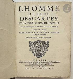 DESCARTES (René). — L'Homme de René Descartes, et la formation du fœtus, Avec les Remarques de Louis de La Forge. — A quoy l'on a ajouté Le Monde ou traité de la lumière du mesme Autheur. — Paris : Théodore Girard, 1677. — In-4, 246 x...