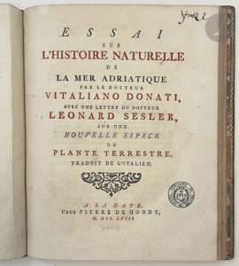 DONATI (Vitaliano). — Essai sur l'histoire naturelle de la mer adriatique… — Avec une lettre du docteur Léonard Sesler, sur une nouvelle espèce de plante terrestre. — La Haye : Pierre de Hondt, 1758. — In-4, veau havane, filet à froid en...