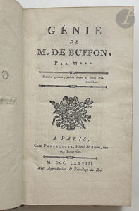 FERRY (Giovanni). — Génie de M. de Buffon, Par M***. — Paris : Panckoucke, 1778. — In-12, veau granité, dos à nerfs orné, tranches rouges (reliure de l'époque).