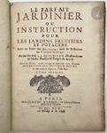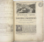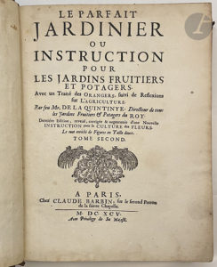 LA QUINTINIE (Jean de). — Le Parfait jardinier ou instruction pour les jardins fruitiers et potagers. — Avec un Traité des Orangers, suivi de Reflexions sur L'agriculture. — Paris : Claude Barbin, 1695. — 2 volumes in-4, basane brune, dos à...