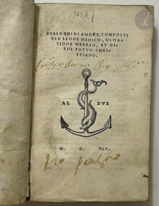 LÉON L'HÉBREU. — Dialoghi di amore, composti per Leoni medico, di natione hebreo, et dipoi fatto christiano. — Venise : in casa de' Figliouli di Aldo [Paul Manuce], 1545. — In-8, parchemin souple à recouvrement, dos à nerfs (reliure de...