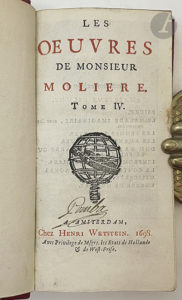 MOLIÈRE. — Les Œuvres. — Amsterdam : Henri Wetstein, 1698. — 4 volumes in-12, demi-chagrin rouge à coins, filets dorés, dos à nerfs, tranches dorées (reliure du XIXe siècle).