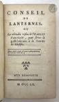 1. CONSEIL DE LANTERNES, ou La véritable vision de Charles Palissot, pour servir de post-scriptum à la Comédie des Filosofes. S.l. : Aux remparts, 1760. — 24 pp. Pièce en faveur de la comédie.
