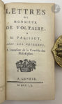 2. LETTRES DE MONSIEUR DE VOLTAIRE, à M. Palissot, avec les réponses, A l'occasion de la Comédie des Philosophes. Genève, 1760. — 68 pp., 2 planches. Complet des deux planches représentant les deux faces d'une médaille.