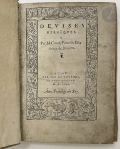 PARADIN (Claude). — Devises héroïques. — Lyon : Jean de Tournes, Guillaume Gazeau, 1557. — In-8, parchemin ivoire, dos lisse, tranches mouchetées (reliure postérieure (XIXe ?) à l'imitation).