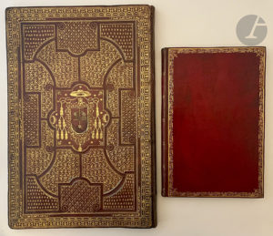 [RELIURE]. — [Belle reliure complète (plats et dos) du XVIIe siècle, en maroquin rouge aux armes d'un ecclésiastique]. — In-folio, 410 x 270 (plats), 410 x 565 (ouvert avec dos), maroquin rouge, plats ornés d'un riche décor doré composé...