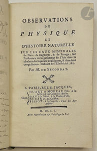 SECONDAT (Jean-Baptiste de). — Observations de physique et d'histoire naturelle sur les eaux minérales de Dax, de Bagneres, & de Barege, sur l'influence de la pesanteur de l'Air dans la chaleur des liqueurs bouillantes, & dans leur congellation....