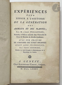 SPALLANZANI (Lazzaro). — Expériences pour servir à l'histoire de la génération des animaux et des plantes. — Avec une ébauche de l'histoire des êtres organisés avant leur fécondation ; Par Jean Senebier. — Genève : Barthelemi Chirol,...