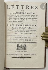 Royale des Sciences de Mantoue, & de l'Académie de Sienne, sur l'air inflammable des marais Auxquelles on a ajouté trois Lettres du même Auteur tirées du Journal de Milan. — Strasbourg : imprimerie de J. H. Heitz, 1778. — In-8, veau havane moucheté, filet à froid en encadrement sur les plats, dos lisse orné, tranches mouchetées rouges (reliure de l'époque).