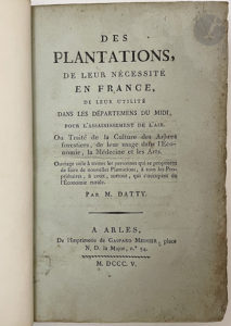 - DATTY. Des plantations, de leur nécessité en France, de leur utilité dans les départemens du Midi, pour l'assainissement de l'air. Ou Traité de la Culture des Arbres forestiers, de leur usage dans l'Économie, la Médecine et les Arts. Ouvrage utile à toutes les personnes qui se proposent de faire de nouvelles Plantations, à tous les Propriétaires, à ceux, surtout, qui s'occupent de l'Économie rurale. — Arles : imprimerie de Gaspard Mesnier, 1805. — viij, 216 pp.