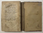 Décolorations moins importantes aux deux autres volumes. Plusieurs feuillets dans le premier volume sont tachés, essentiellement à la fin, et le dernier feuillet est dérelié. Rousseurs.