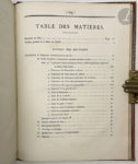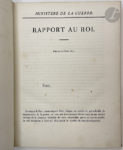 Édition originale du rapport fait au roi par le Duc de Clermont-Tonnerre (1779-1865) sur le budget du ministère de la guerre pour 1826. Y sont relevées les dépenses de l'administration centrale, les traitements, soldes et dépenses pour les différents corps d'armée (maréchaux, officiers, gendarmerie, infanterie, cavalerie, etc), le budget pour la maison du roi, les subsistances militaires, le chauffage, l'habillement, les hôpitaux, le casernement, le recrutement, la justice militaire, les transports, l'ordre de Saint-Louis, les écoles militaires, etc.