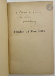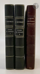 – BOURGET (Paul). Études et Portraits. I. Portraits d'écrivains. II. Notes d'esthétique. III. Études anglaises. IV. Fantaisies. Paris : Alphonse Lemerre, 1889. — 2 volumes in-16, demi-maroquin bleu foncé à coins, filets dorés, dos à nerfs orné, tête dorée, non rogné (reliure de l'époque).