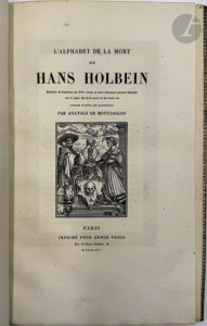 Édition publiée par Anatole de Montaiglon, reproduisant l’alphabet de la mort dessiné par Hans Holbein et gravé à l’époque par H. Lutzelburger.
