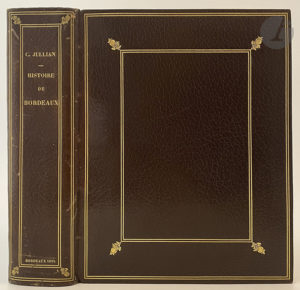 JULLIAN (Camille). — Histoire de Bordeaux depuis les origines jusqu'en 1895. — Bordeaux : Feret et fils, 1er Mai 1895. — In-4, maroquin brun foncé, plats ornés d'un décor doré à la Duseuil, dos lisse orné, doublures de maroquin grenat...