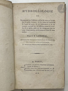 LAMARCK (Jean-Baptiste de Monet de). — Hydrogéologie ou Recherches sur l'influence qu'ont les eaux sur la surface du globe terrestre ; sur les causes de l'existence du bassin des mers, de son déplacement et de son transport successif sur les...