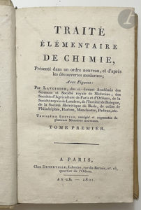 LAVOISIER (Antoine-Laurent de). — Traité élémentaire de chimie, Présenté dans un ordre nouveau, et d'après les découvertes modernes. — Paris : Deterville, An IX-1801. — 2 volumes in-8, parchemin rigide, dos lisse, tranches jaspées...