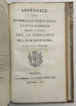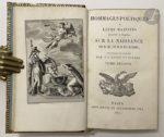 Bel exemplaire sur papier vélin, au format in-8, en maroquin de l'époque sur lequel on a apposé postérieurement, sans doute au XXe siècle, les armes de Napoléon. Il est bien complet de l' « Appendice aux hommages poétiques à leurs majestés Impériales et Royales, sur la naissance de S. M. le roi de Rome » publié par Jean Eckard en novembre 1811.