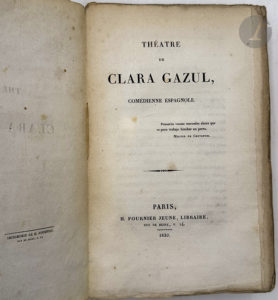 MÉRIMÉE (Prosper). — Théâtre de Clara Gazul, comédienne espagnole. — Paris : H. Fournier jeune, 1830. — In-8, broché, chemise à dos à nerfs de maroquin bleu et étui modernes.