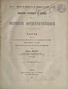 PETIT (Pierre). — Recherches anatomiques et cliniques sur la nephrite dothiénentérique. — Lyon : imprimerie de A. Stock, 1881. — In-4, maroquin rouge, triple filet doré en encadrement sur les plats, dos à nerfs orné, doublures de maroquin...