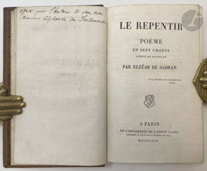 Ce dernier fit relier l'exemplaire vers 1850 en y ajoutant 12 pages in-8 de poèmes autographes de l'auteur, et 4 pages de notes de sa main sur Sabran. Il est également enrichi de cette note autographe signée au verso de la première garde : « Ce poème de feu le Comte Elzéar de Sabran m'a été donné par // lui en 1827 ou 1828 : quelques fables, vers, etc, inédits // je le crois, autographes, sont à la suite de cet exemplaire // de son poème Le Repentir, et je lègue le tout à // la Bibliothèque royale de la rue de Richelieu, à // Paris. // Ce mercredi matin, 3 novembre mil-hui-cent-quarante-sept, rue // Lepelletier, n° 20, à Paris. // Alph. de Fontvanne. »