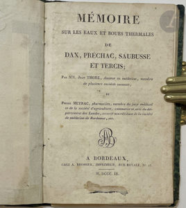 THORE (Jean) - MEYRAC (Pierre). — Mémoire sur les eaux et boues thermales de Dax, Préchac, Saubusse et Tercis. — Bordeaux : A. Brossier, 1809.