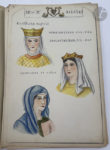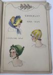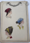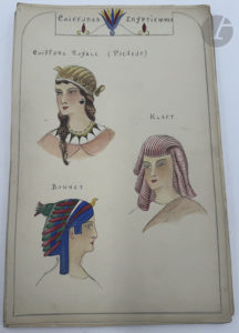 Beau manuscrit consacré à l'histoire de la coiffure depuis l'Antiquité jusqu'aux années 1930, composé par une certaine Eva Servaix. — Il se compose d'un titre calligraphié, de 28 feuillets de texte et, à part, de 26 feuillets proposant 81 dessins originaux de coiffes au crayon, à l'encre de Chine et à l'aquarelle.