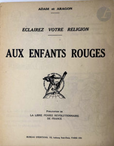 ADAM (Georges) - ARAGON (Louis). — Éclairez votre religion. Aux enfants rouges. — Paris : La Libre pensée révolutionnaire de France, [1932]. — Plaquette in-4, agrafée.