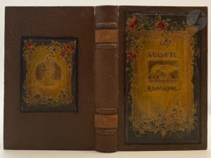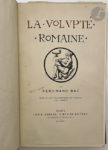 BAC (Ferdinand). — La Volupté romaine. — Paris : Louis Conard, 1922. — In-8, maroquin brun, plats ornés d'une grande pièce de veau havane comprenant un joli décor ciselé et peint, différent sur chacun des plats, dos à nerfs avec deux...